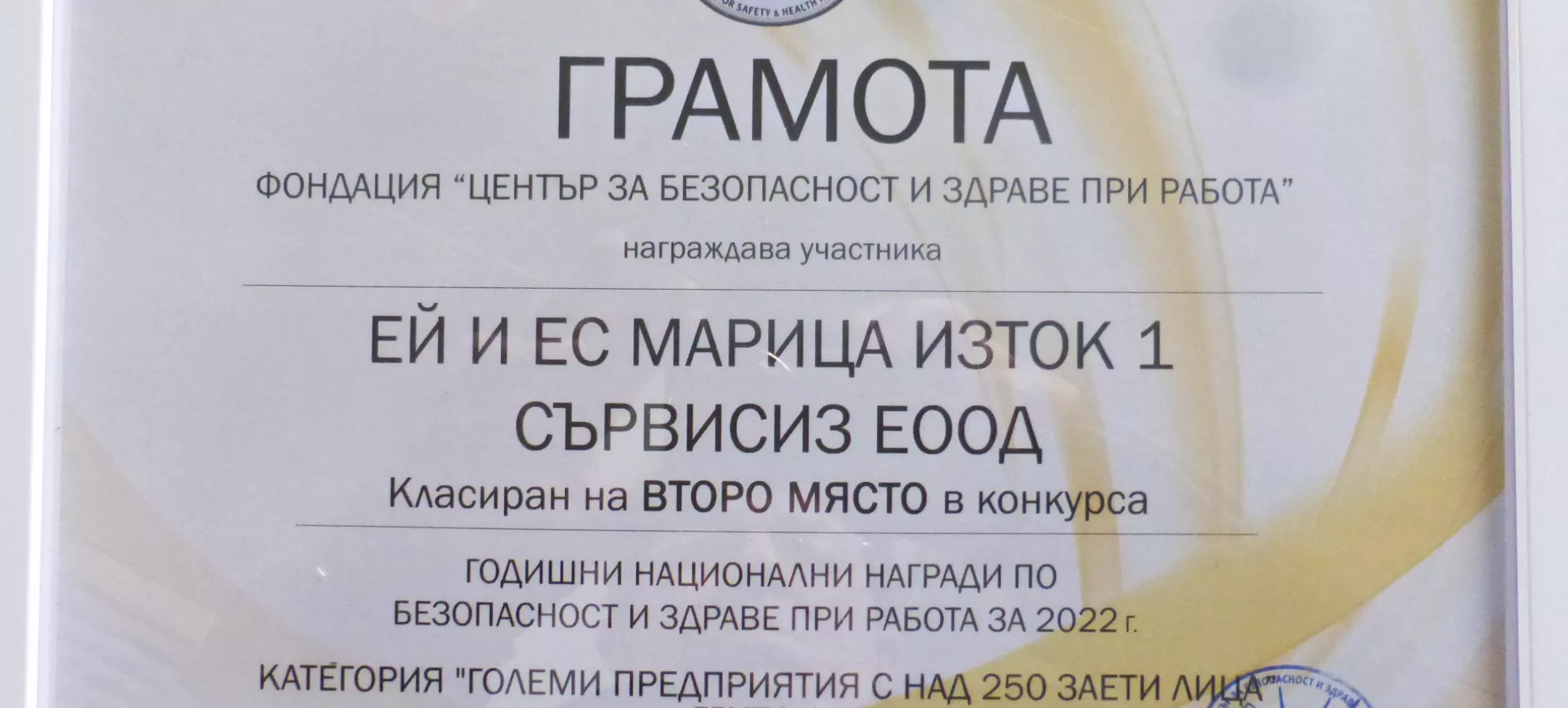 AES Maritza East 1 Services received the Safety and Health at Work Award given by the Center for Safety and Health at Work Foundation. The competition was organized by the foundation for the 13th time and was held with the support of the General Labor Inspectorate Executive Agency.